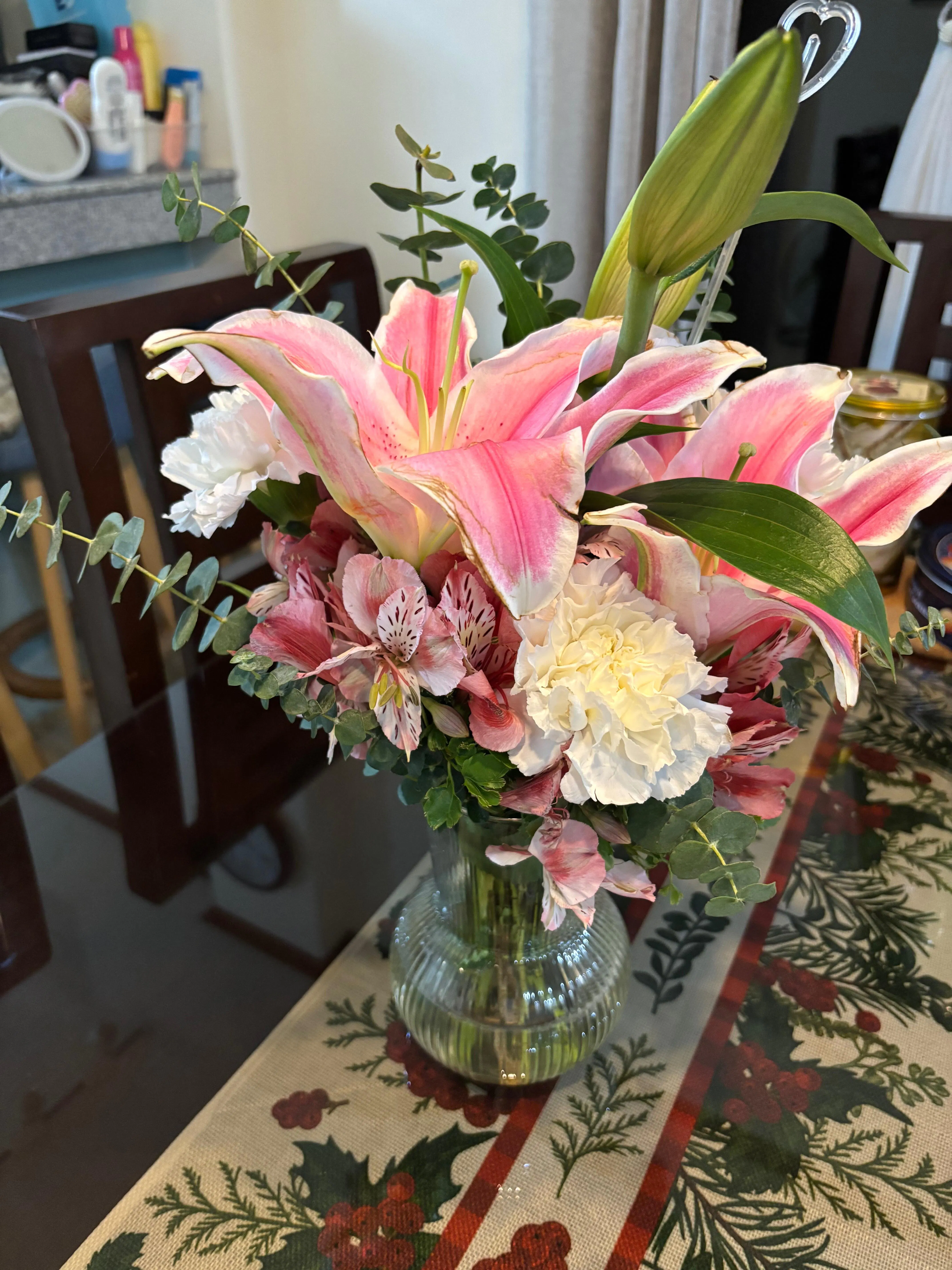 Ordering was straight forward. It was seamless. My mom got the flowers and cake as scheduled. This was my second time purchasing flowers from you guys, and my mom loved her flowers! The quality of the flowers were amazing. She loved the Colors and they were fresh! The reason why I gave a rating of 8 only was that, the vases that were used, were dirty. The glass vases were cloudy/foggy. Hence, she used our own vase instead. Other than that, the rest were wonderful. I’ll be ordering again soon. Thank you.