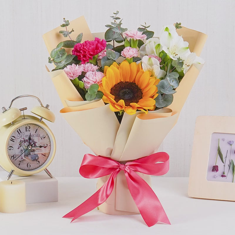 Bouquet: 20cm (H) x 15cm (L)Box: 25cm (W) x 25cm (L) x 10cm (H)