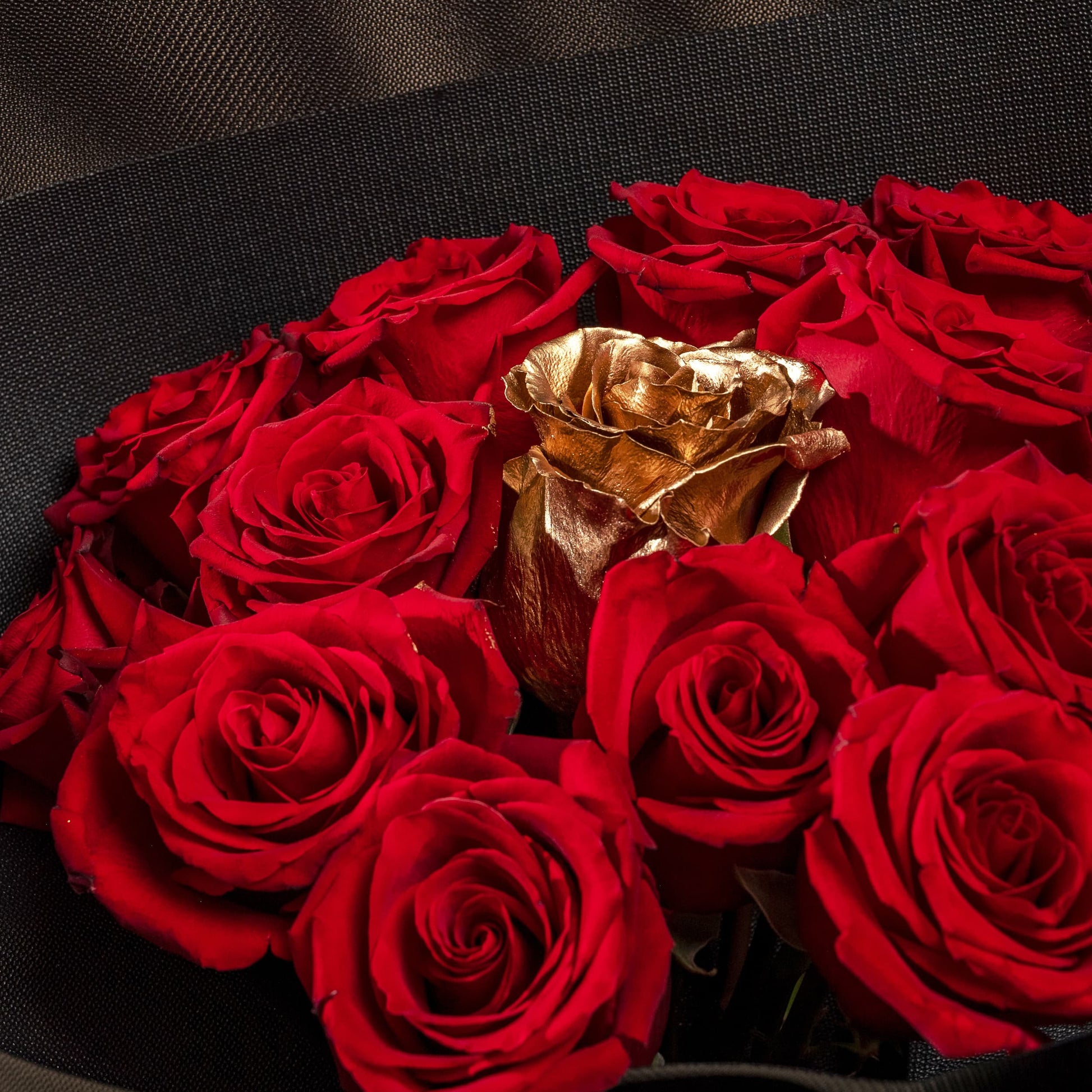 Finding someone who makes your world brighter isn't just rare, they're your one and only, and this stunning arrangement says it all. Featuring 11 premium red roses and 1 striking gold rose that stands beautifully apart, it's a powerful symbol of that one person who changes everything and makes every moment extraordinary.